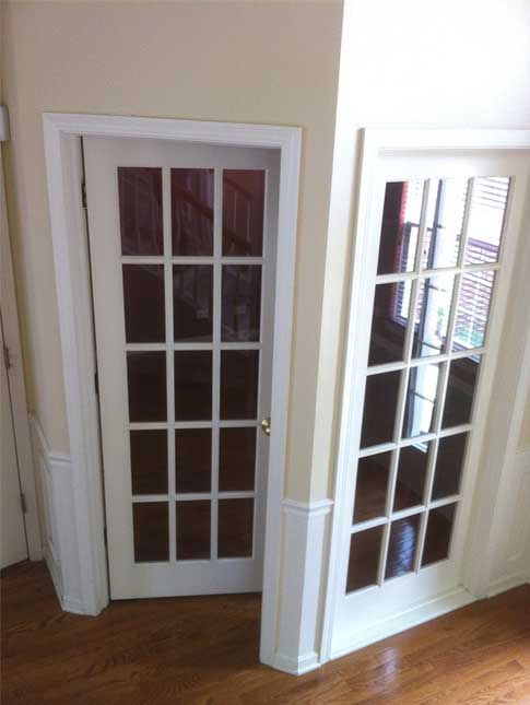 Interior door replacement is one of the most overlooked renovation options in the home. Many homeowners do not realize that simply replacing just the door panels (or slabs) can have a substantial impact on the appearance of the interior of your home. Adding wider casings, taller base moldings and even crown moldings can add a richness to the home that the original builder did not provide. Other popular projects include wrapping existing vinyl windows with casing and adding French doors to enclose dining rooms, offices or other spaces.